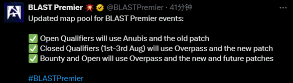 BLAST也发布了类似的更新公告,确认从8月1日起,Overpass将被纳入其BLAST晋升赛资格赛的地图池。然而,七月份的公开预选赛将继续使用Anubis。
