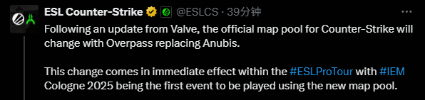 在ESL宣布此项变动将“即日起”影响 ESL后,Overpass将取代Anubis出现在2025年IEM科隆站的比赛中。