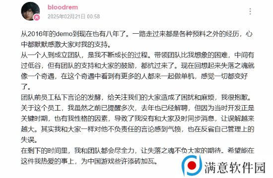 国产动作RPG游戏《失落之魂》(Lost Soul Aside)将于2025年内正式发售,自公布以来一直备受关注。早在先前,失落之魂团队前员工在曾在玩家群中发表不当言论,这些言论被曝光后,制作人杨冰回应称,该员工已于去年被解聘。近日失落之魂制作人杨冰发文回应前员工私下言论的争议,我们来看看。