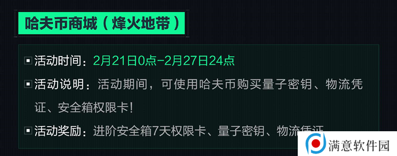 活动说明:活动期间,可使用哈夫币购买量子密钥、物流凭证、安全箱权限卡