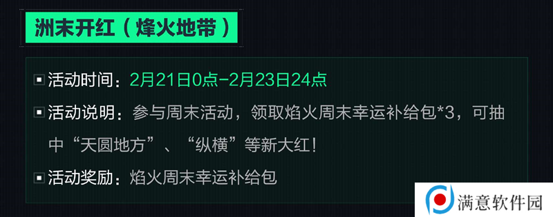 活动说明: 参与周末活动,领取焰火周末幸运补给包*3,可抽中“天圆地方”、“纵横”等新大红!