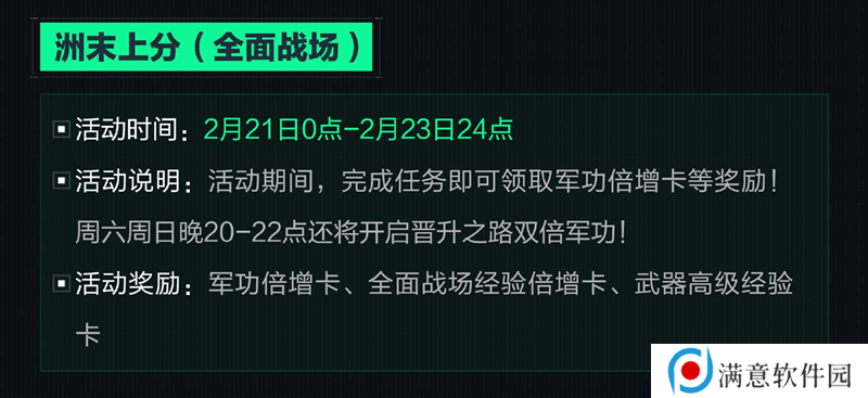 活动说明: 活动期间,完成任务即可领取军功倍增卡等奖励周六周日晚20-22点还将开启晋升之路双倍军功!
