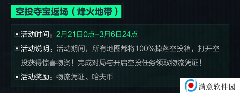 活动说明: 活动期间,所有地图都将100%掉落空投箱,打开空投获得惊喜物资!完成对局与开启空投任务领取物流凭证!