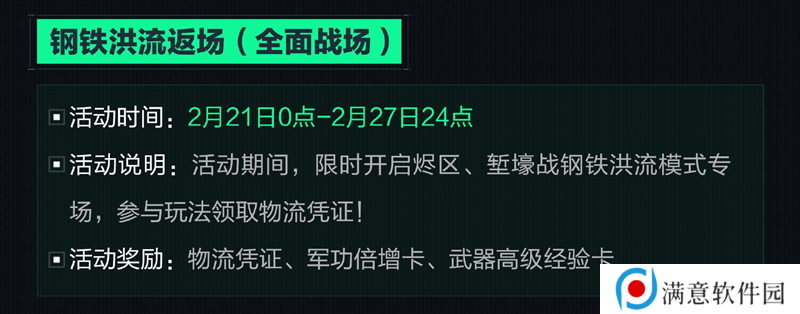 活动说明: 活动期间,限时开启烬区、堑壕战钢铁洪流模式专场,参与玩法领取物流凭证!