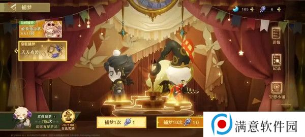 在天方夜谭中,每10次捕梦必得一位四星或以上梦灵,每60次捕梦保底必得五星梦灵。同一星级的所有梦灵均分出率(天方夜谭】的捕梦类型为常驻捕梦、与其他类型捕梦活动的捕梦保底次数相互独立计算,互不影响。