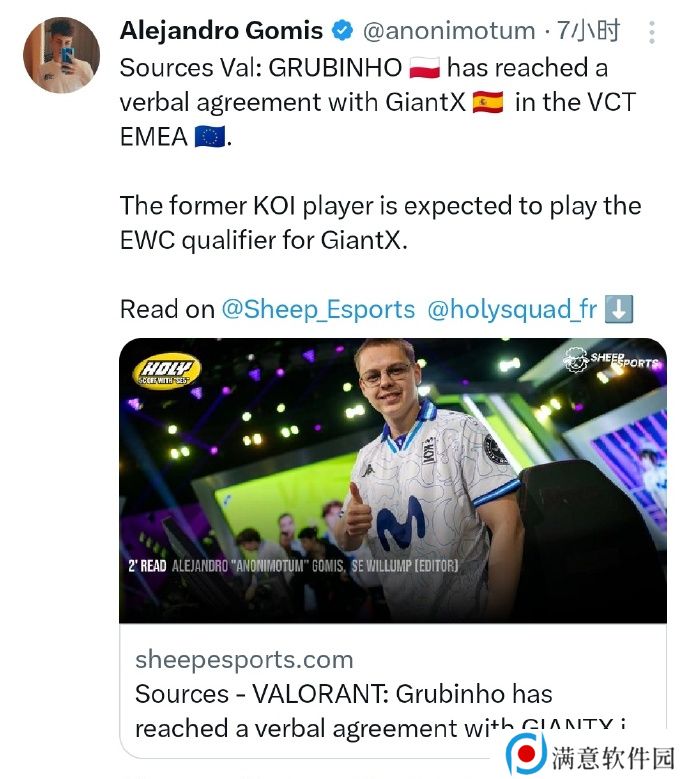 据海外媒体人消息,前KOI选手GRUBINHO与GiantX达成口头协议,预计将在EWC选拔赛时就代表后者出场。