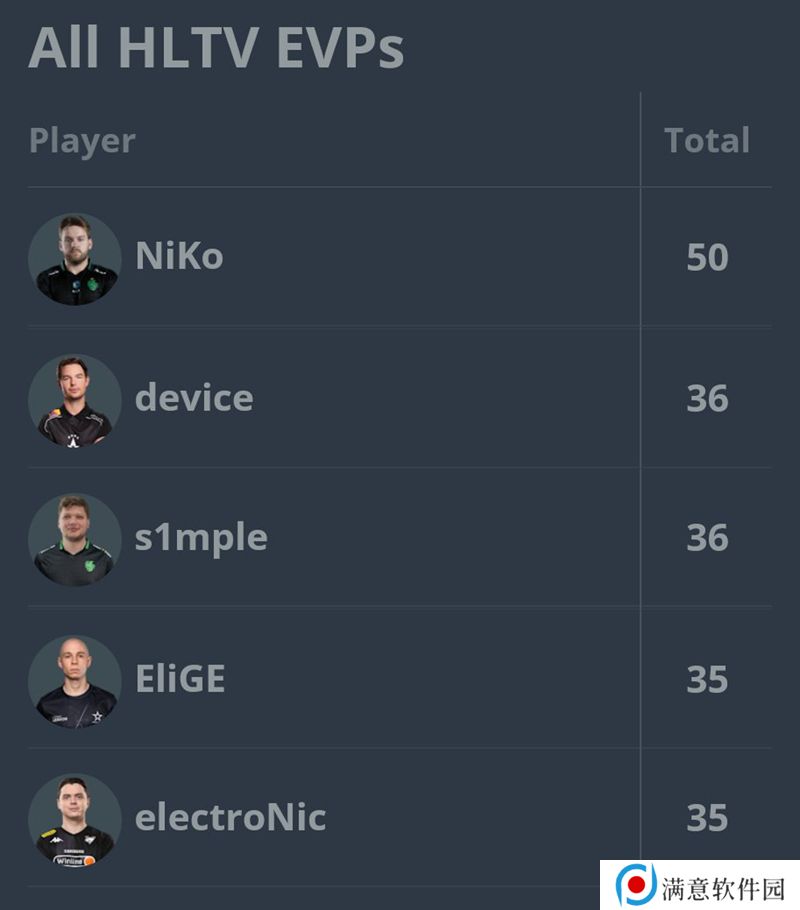 而NiKo也是目前拥有最多HLTV EVP荣誉的选手,device和s1mple并列第二名,为36个。EliGE和electroNic并列第三名,各35个EVP。
