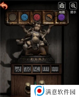 找到大柜子里的哪吒(或类似)雕像,将之前获得的两个工艺品放置其上,结合电脑显示的图案,解开密码。
