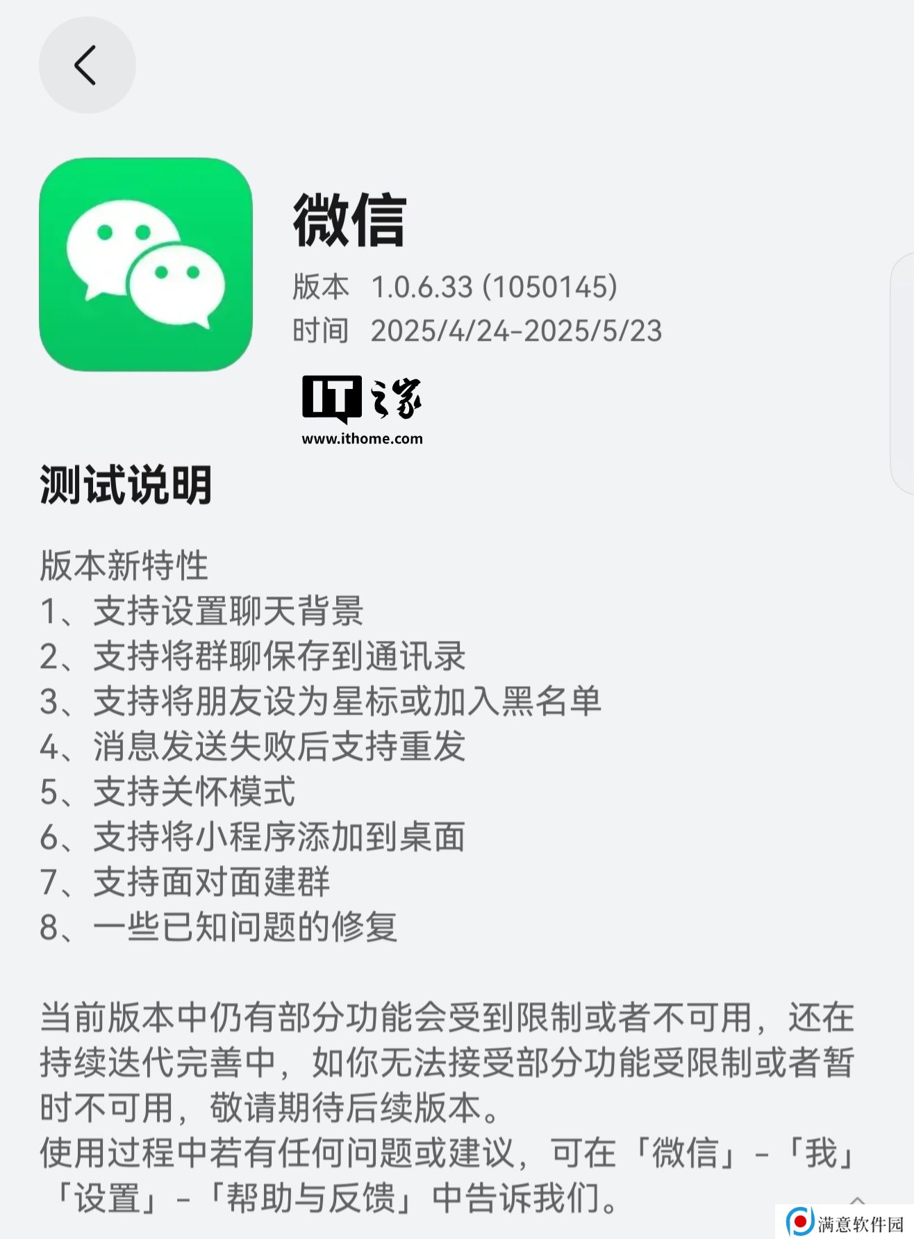 本站 4 月 24 日消息,微信鸿蒙版 App 今日在华为应用市场(App Gallery)开启1.0.6.33(1050145)版本邀测升级(需收到短信通知后点击链接跳转安装,未收到短信需继续等待),测试时间为 2025/4/24 - 2025/5/23。这也是微信本周发布的第四次邀测升级。