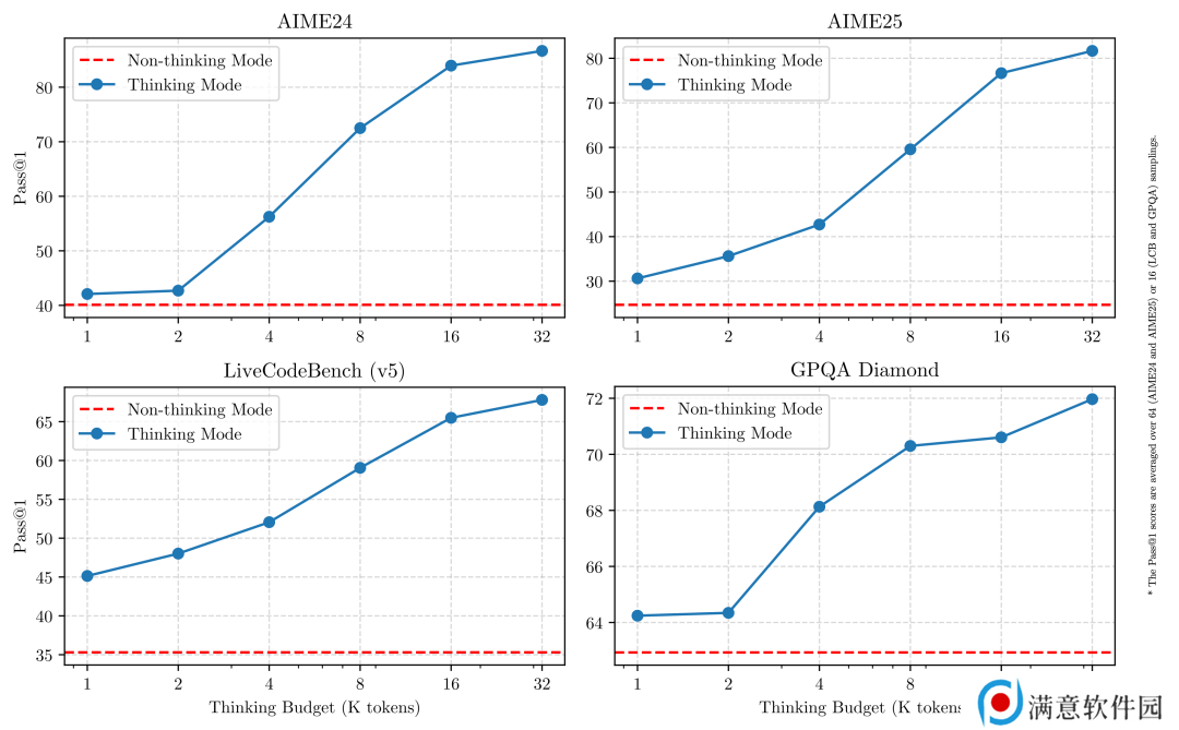 至关重要的是,这两种模式的结合大大增强了模型实现稳定且高效的“思考预算”控制能力。如上文所述,Qwen3 展现出可扩展且平滑的性能提升,这与分配的计算推理预算直接相关。这样的设计让用户能够更轻松地为不同任务配置特定的预算,在成本效益和推理质量之间实现更优的平衡。